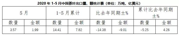 2020年1-5月,中国茶叶累计出口量为14.41万吨,同比减少5.25%;累计出口额为7.82亿美元,同比增加4.26%;出口均价为5.43美元/千克,同比上涨10.03%。